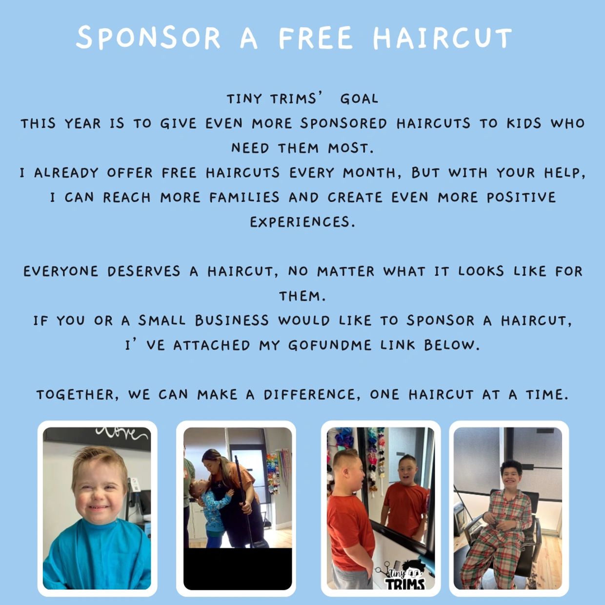 Now, I’m asking for your help to keep Tiny Trims going — to provide free haircuts for families in need and continue offering a safe, loving space for every child who walks through my door.